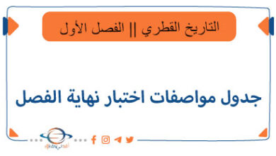 تجد هنا جدول مواصفات اختبار نهاية الفصل الأول في مادة تاريخ قطر والمواطنة للصفوف من الأول الابتدائي للتاسع الاعدادي وفق…